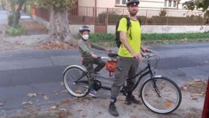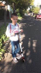 Mozgása igazán vagány, kortársaihoz nagyon hasonló. Szeret bringázni, rollerezni, fára mászni, sőt görkorizni is megtanult! A játszótéren a legmagasabb helyeket keresi, úgy érzem behozta a lemaradását. Az ovis mozgásfejlesztésen persze olyan komplex mozgás feladatok vannak, amelyeken sokszor elvérzik. Az összetettebb folyamatokat már sajnos nem tudja leutánozni. Férjem vett ősszel egy tandem biciklit, és kitalálták, hogy ők szép időben azzal fognak oviba járni. Na, most ez kb. 10 km-es táv, amit reggel 7 kor és hazafelé 4 után kell megtenniük. Pityus nagyon élvezi, teker végig, ha elfárad felteszi a lábát a vázra. Jó kis edzés, ami erősíti a kapcsolatukat is.